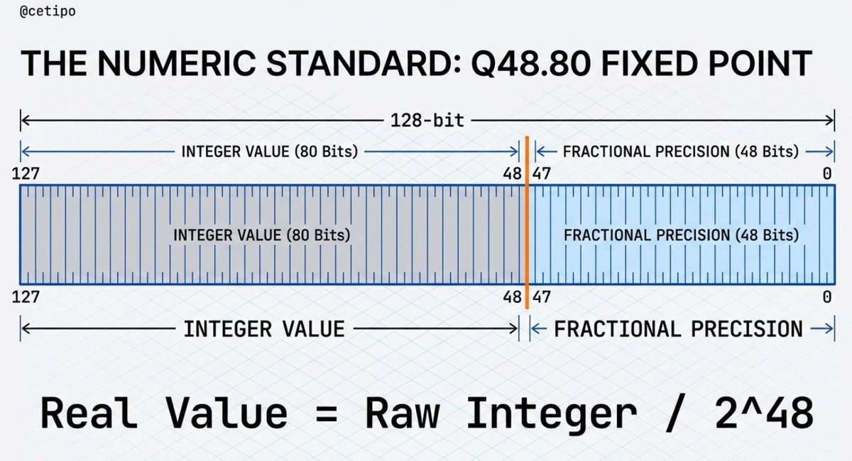 The protocol uses Q48 fixed-point arithmetic — 48 bits for the fractional part, providing approximately 14 decimal places of precision. This level of precision is critical for accurate pricing in high-frequency trading environments.